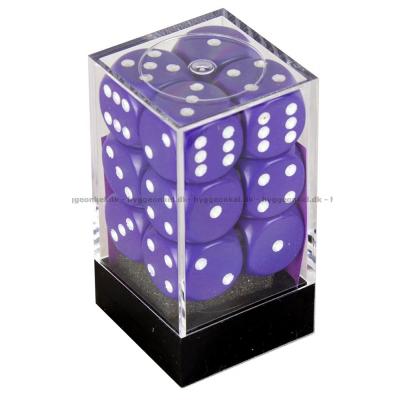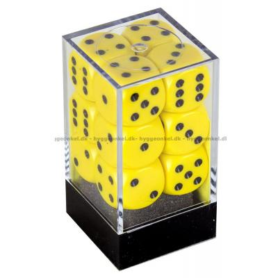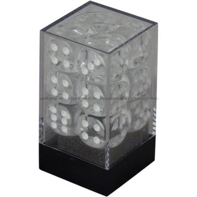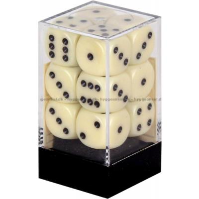 Här får du 12 stycken 6-sidiga tärningar i svart med vita prickar. Sidorna mäter klassiska 16 mm.