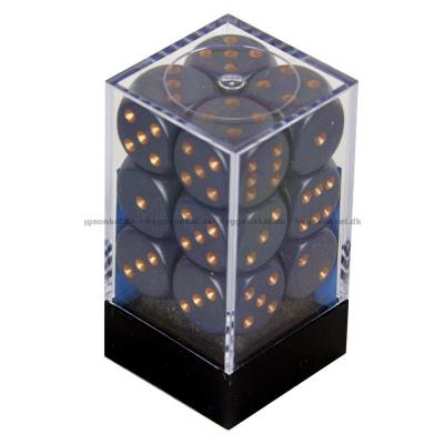 12 tärningar i svart som levereras i en liten plastbox. Tärningarnas material är hårdplast.