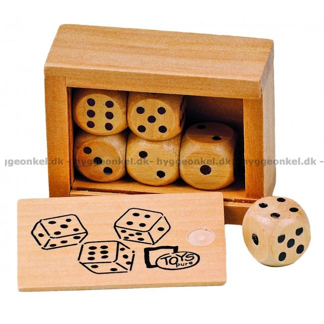 6 tärningar i trä i en box av trä. Varken mer eller mindre. Sidorna på tärningarna mäter 16 mm.