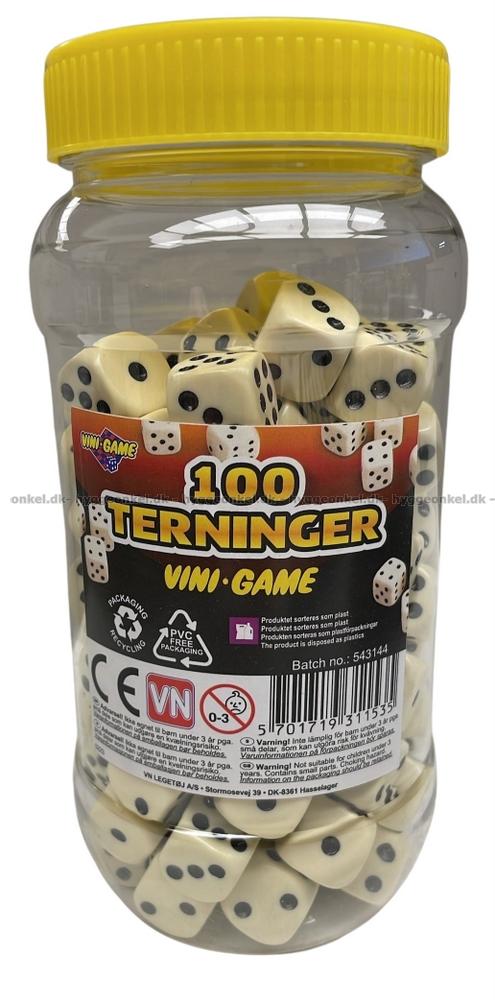 Visst är det väl konstigt hur tärningar bara kan försvinna? Här får du 100 stycken samlade i en burk med skruvlock. Det ska nog räcka ett tag!