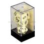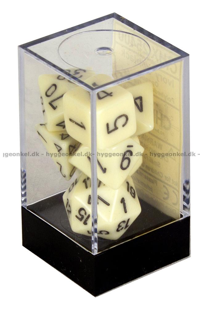 Tärningarna är elfenbensfärgade med svarta siffror.
