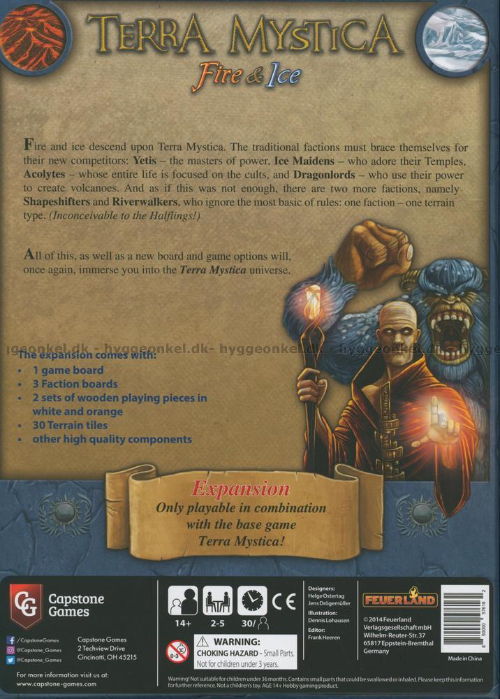 I denna expansion till Terra Mystica kommer du att få möta Yetis (härskare över krafterna), Ice Maidens (som älskar sina tempel), Acolytes (som är helt fokuserade på sina sekter) och Dragonlords (som har kraften att skapa vulkaner).