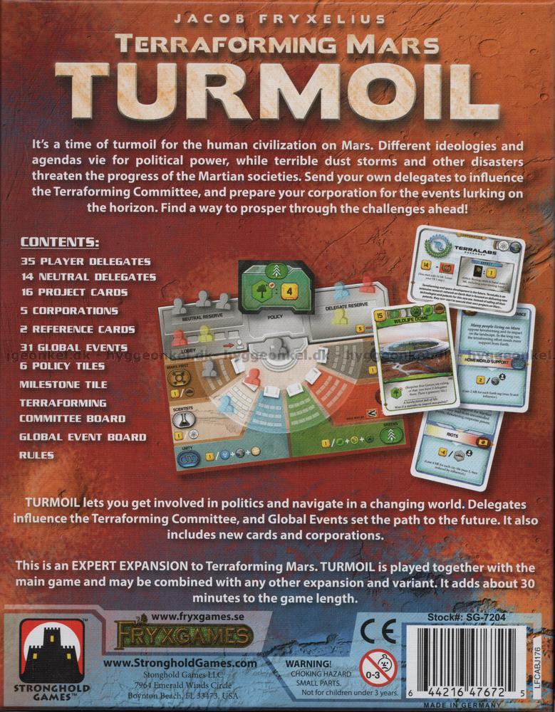 Turmoil är en expansion till Terraforming Mars. Du måste ha grundspelet för att kunna spela med den här expansionen.