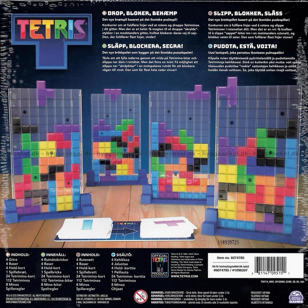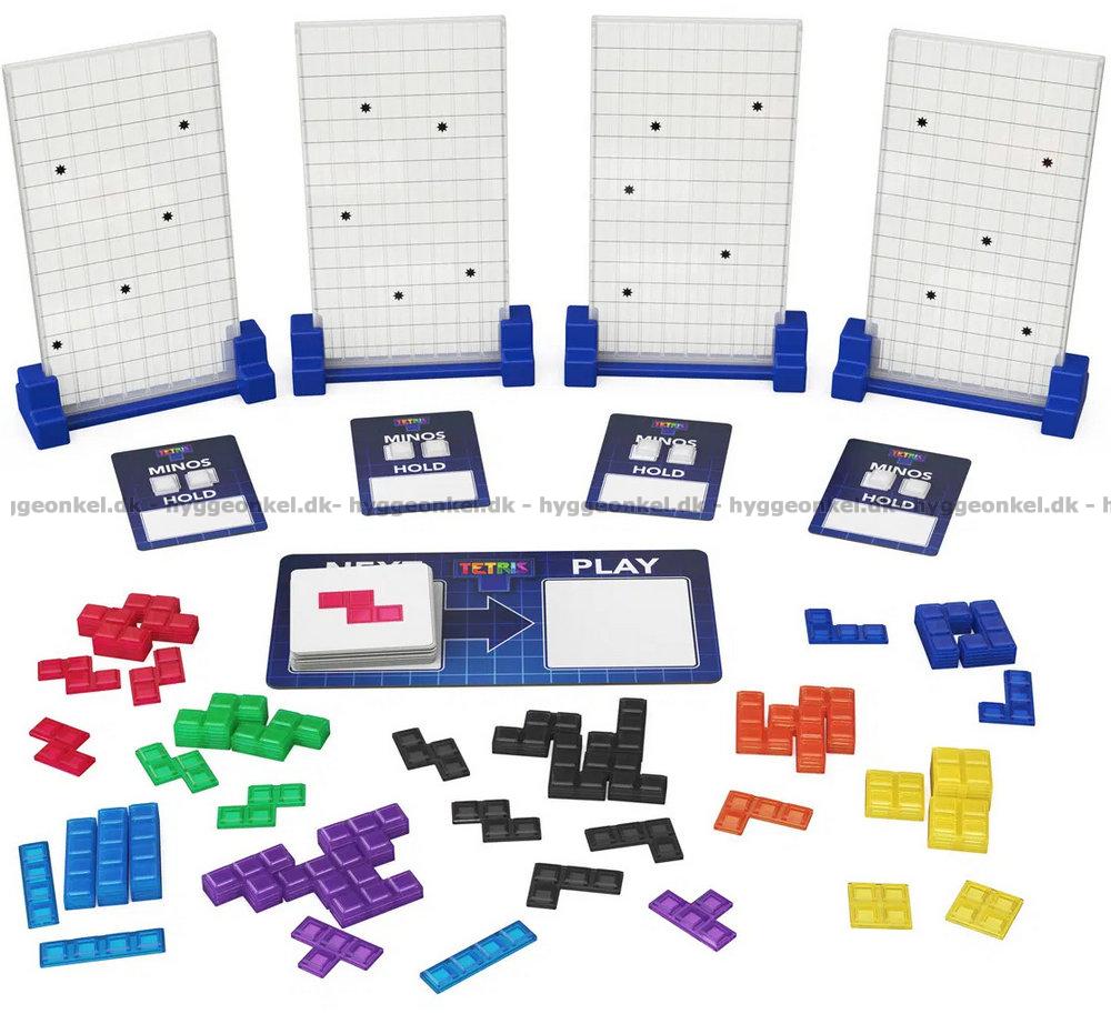 Ta det klassiska datorspelet Tetris till matbordet och utmana dina vänner. Här gäller det att tänka snabbt, planera dina drag och släppa dina Tetriminos exakt ner i rutnätet för att fullborda rader – precis som i det ikoniska digitala spelet. Men var försiktig, för det finns en överraskande twist! Med de speciella förmågorna kan du kasta “skräp”-bitar ner i dina motståndares rutnät och blockera deras väg till seger. Varje runda avslöjar Tetrimino-korten vilken form du ska använda och vad som väntar nästa gång – och då gäller det att tänka och agera snabbast.