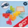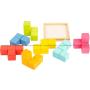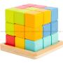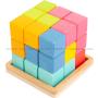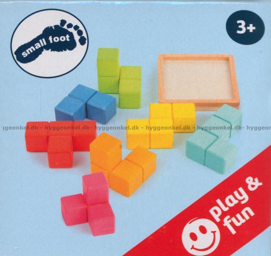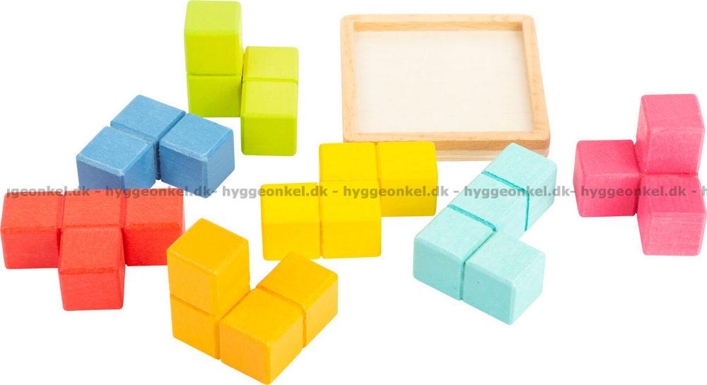 En kub med 7 Tetris-brickor i trä. Kuben mäter 6 x 6 x 6 cm.