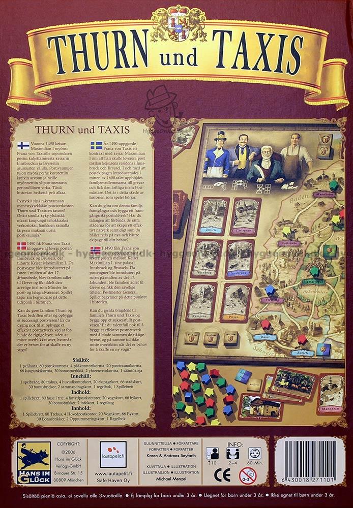 Thurn und Taxis är skaparen av Puerto Rico, Andreas Seyfarths , och hans hustru Karens verk. Jämfört med just Puerto Rico så är Thurn und Taxis av en snäppet enklare kaliber, vilket säkert delvis var en orsak till att det vann Spiel des Jahres år 2006.