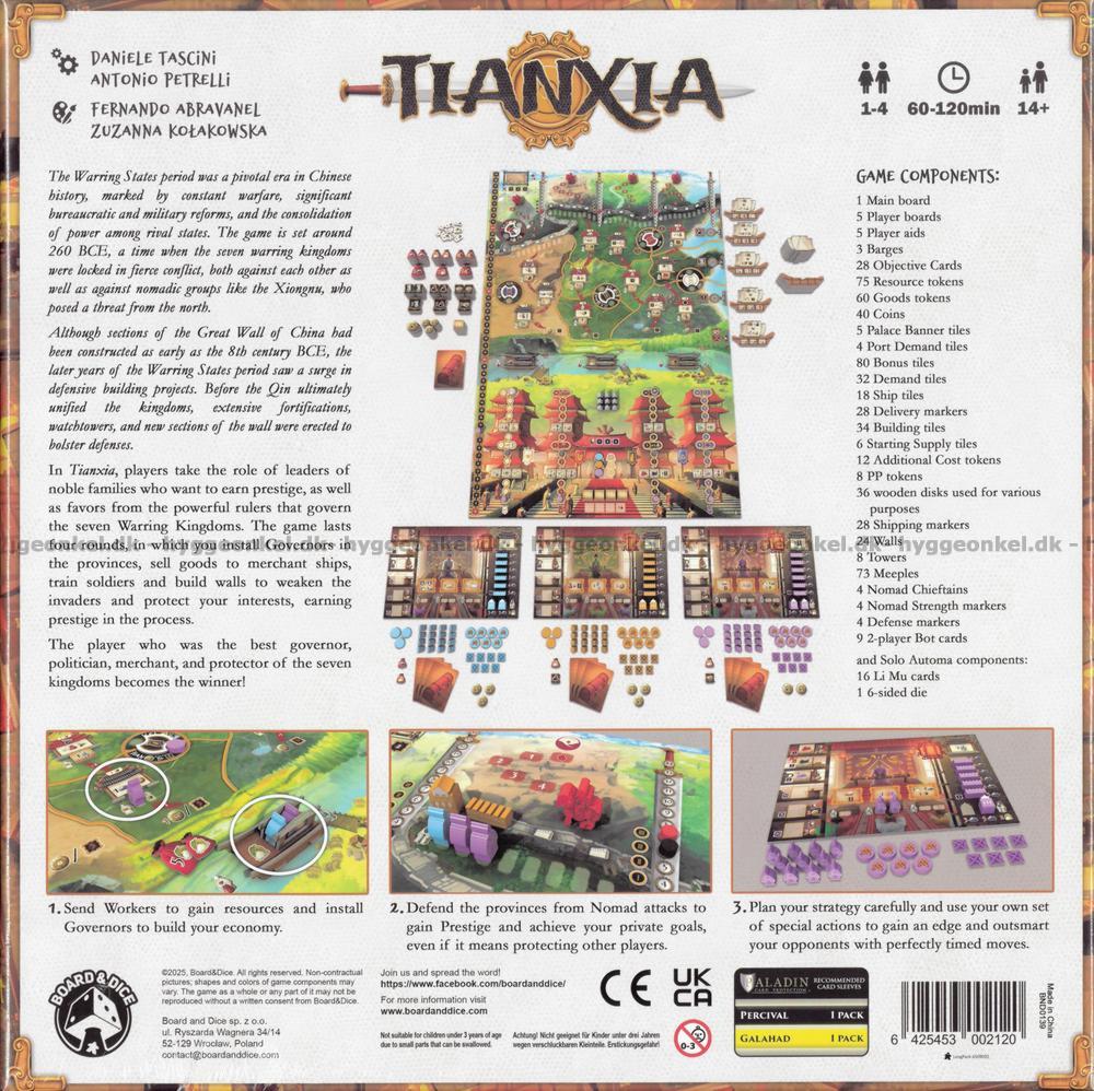 Under fyra intensiva omgångar utser du guvernörer i regionerna, stöttar de styrande husen, handlar med köpmän längs kusten och bygger upp dina resurser. Samtidigt måste du träna soldater och resa murar och torn för att skydda riket mot invasioner från Xiongnu, som hotar att bryta igenom gränserna. Spelet kombinerar strategi, långsiktig planering och taktiska val, där både samarbete och konkurrens spelar en roll när fienderna marscherar mot muren. Vinnaren är den som lyckas utmärka sig som både guvernör, köpman, politiker och beskyddare och därmed vinner äran i Tianxia.