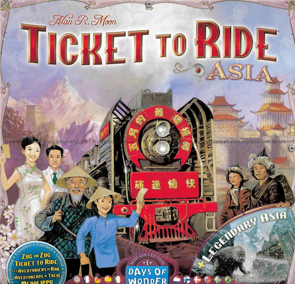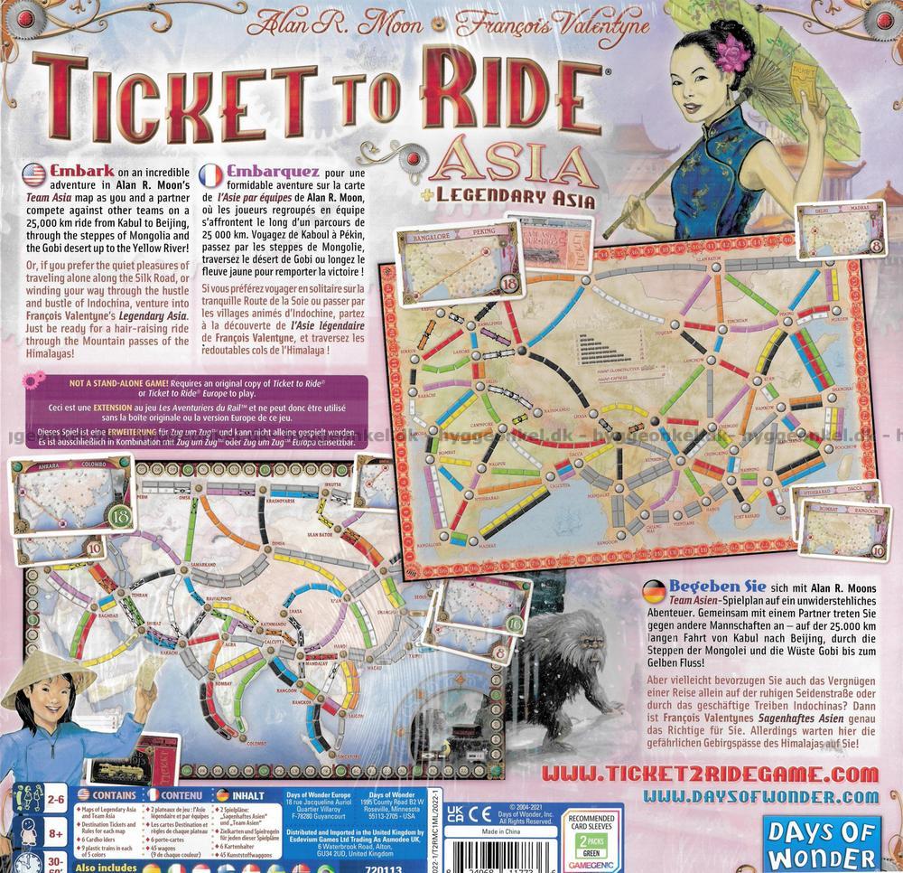 Denna expansion till Ticket to Ride innehåller ett dubbelsidigt spelbräde med 2 olika sätt att spela med Asien som tema.