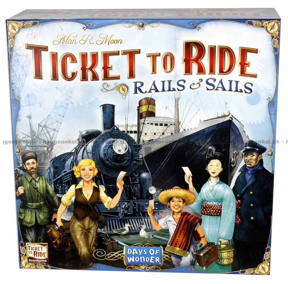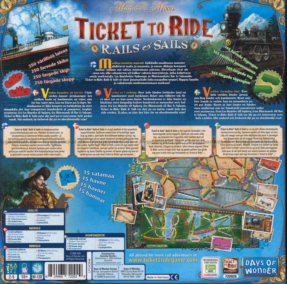 I boxen hittar du ett stort dubbelsidigt spelbräde (54 x 96 cm). Därutöver finns kort, tåg, fartyg, hamnar och poängmarker. Tåg, fartyg och hamnar är i plast.