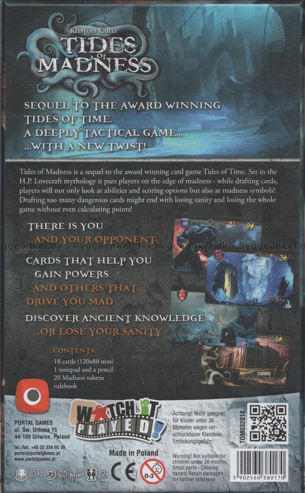 I Tides of Madness finns 18 kort - 5 kulörer med 3 kort i varje och dessutom 3 kort utan kulör. Korten har en rad olika värden och dessa kan utläsas på varje enskilt kort.