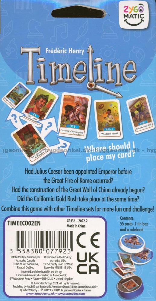 Spelet går ut på att du ska placera ett kort mellan två andra kort ute på bordet. När det är placerat ska du vända på det och se om årtalet passar mellan de två befintliga korten i tidslinjen.