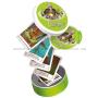 Spelet kommer i en fin rund metallbox som mäter 9 cm i diameter och 2,5 cm på höjden. Den tar alltså inte mycket plats på hyllan eller i väskan.