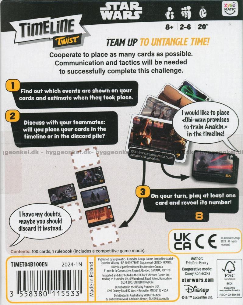 Timeline Twist Star Wars har 100 unika kort, vart och ett med en viss händelse, och spelarna samarbetar med att placera dem på en tidslinje och tjäna poäng.