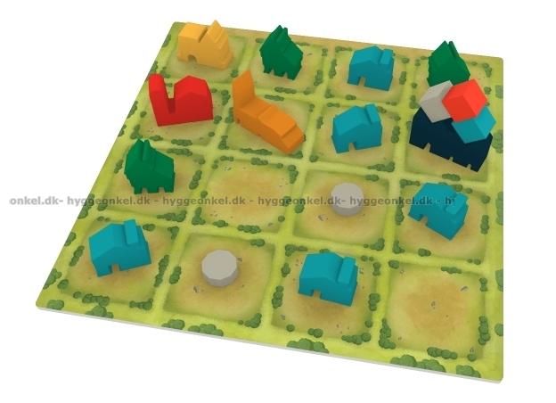 Från början har du också en rad kort utifrån vilka du ska bygga din stad. På varje kort hittar du ett mönster som ska matchas på spelplanen. Att bygga en gård kräver till exempel 2 x vete och 2 x trä i resurser som ska placeras i ett visst mönster på spelplanen.