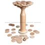 Träflaska (20 cm hög - 5 cm diameter i toppen) - 100 trämarker (3 cm i diameter och 0,3 cm höga) och 1 tärning.