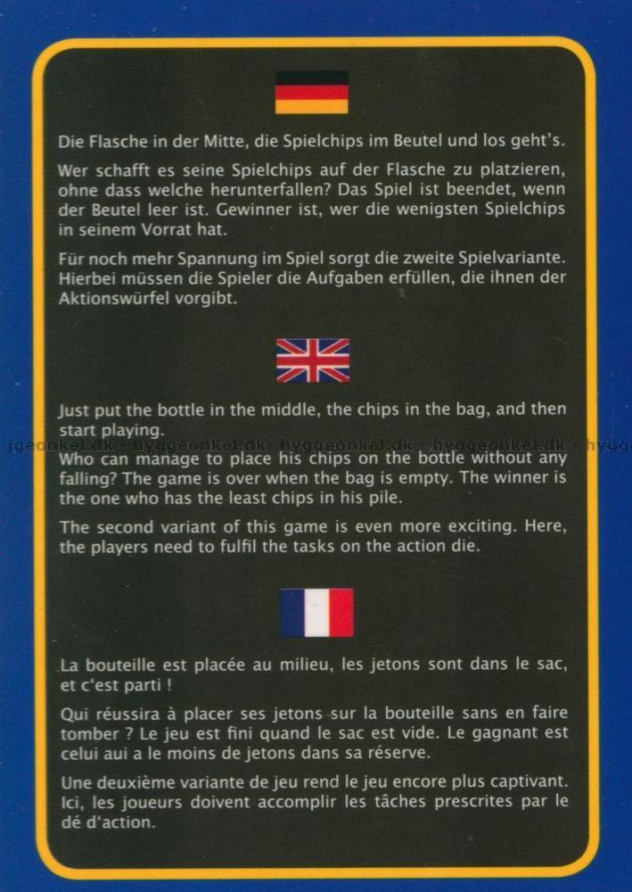 När det är ens tur tar man en bricka från tygpåsen och placerar den på flaskan.