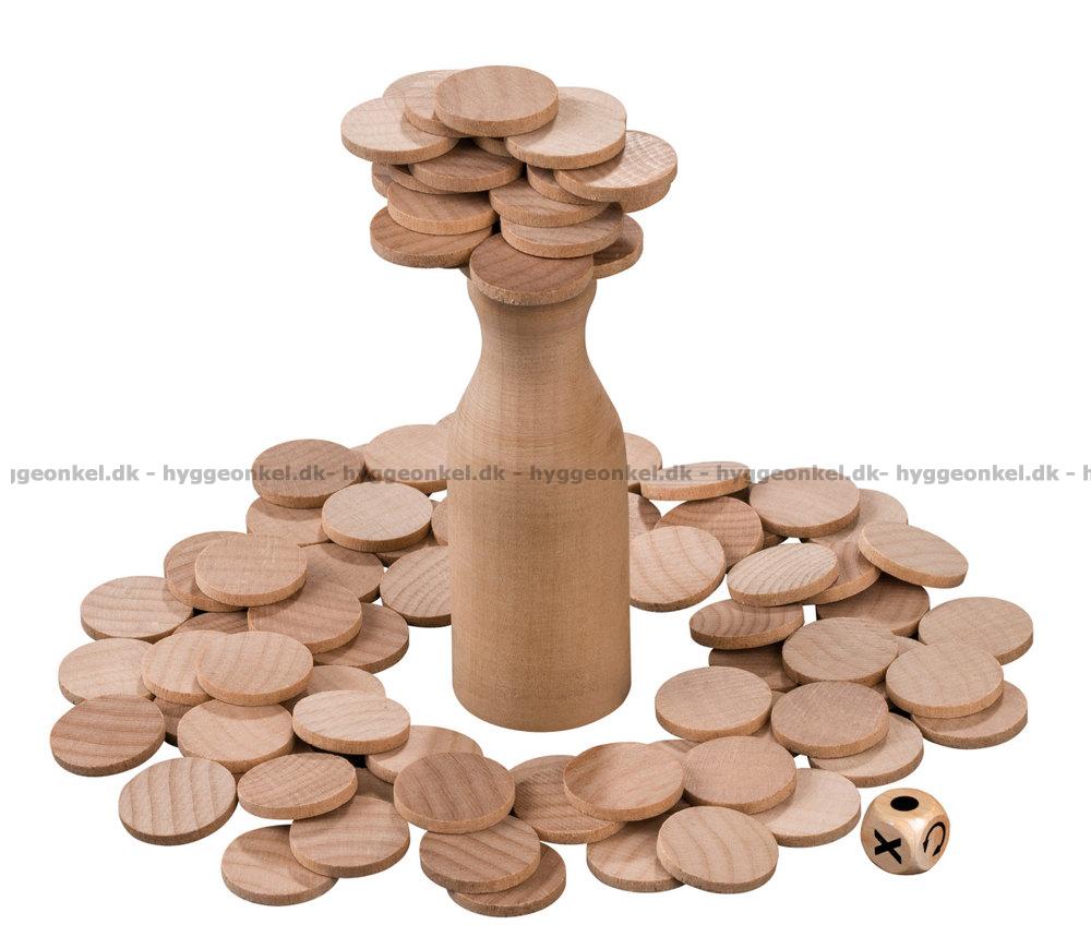Målet med Top the Bottle är att stapla brickorna på träflaskan utan att någon bricka ramlar ner.