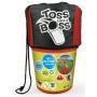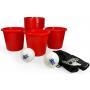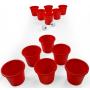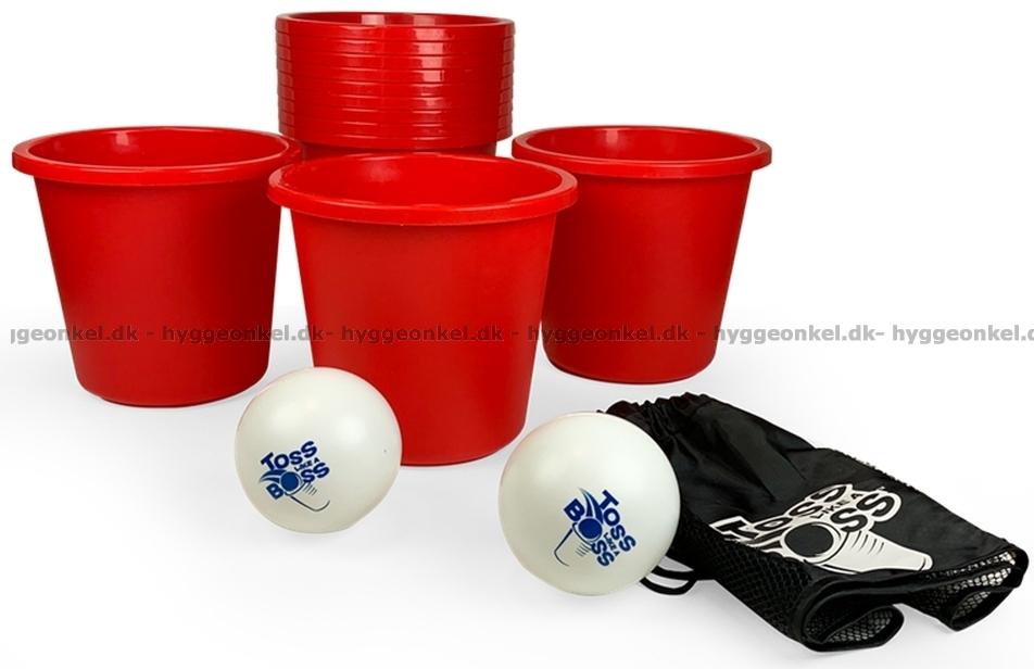 12 hinkar i plast (18 cm höga - 15 cm i diameter), 2 plastbollar (av typen pingisboll men med en diameter på 10 cm) och 1 nät för förvaring.