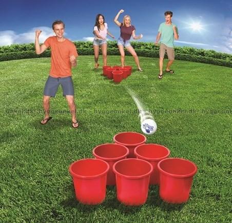 Ställ upp hinkarna och se om du kan träffa med bollen i en av dem! Så enkelt är det att spela "hink-spel".