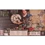 Spelbräde, miniatyrfigurer i plast, kort, tärningar och marker.