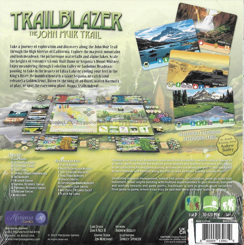 Trailblazer: The John Muir Trail bjuder in dig till en tolv dagar lång vandring genom Californiens High Sierra, där du följer den legendariska John Muir Trail från frodiga dalar till ikoniska bergstoppar. Varje spelare upplever en expedition fylld med naturupplevelser, växlande väderförhållanden och strategiska val, där du samlar resurser, utforskar spektakulära destinationer och utrustar din ryggsäck med viktig utrustning som ger nya fördelar längs vägen.
