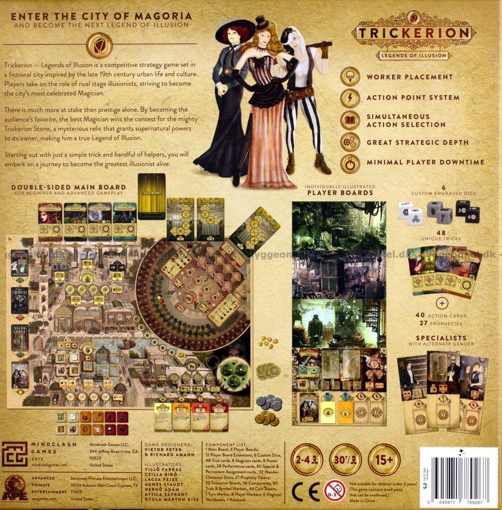 1 dubbelsidigt spelbräde, individuella spelplattor, 6 specialtärningar, 48 trick samt kort och marker i mängder.
