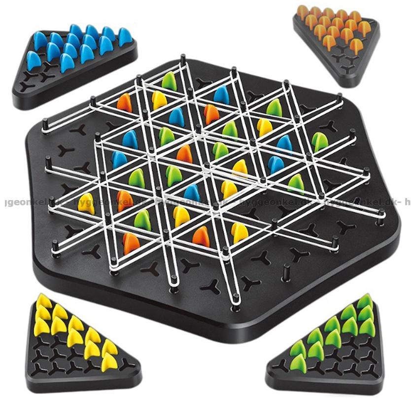 Genom att spänna ett gummiband över fyra piggar på brädet bygger du gradvis ett nät av möjligheter – men det gäller att vara smart, för varje gång du sluter en triangel får du lägga en bricka och göra området till ditt.