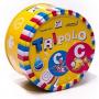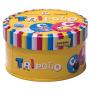 Spelet ligger i en liten metallbox, som mäter 9 cm i diameter och är 5 cm hög.