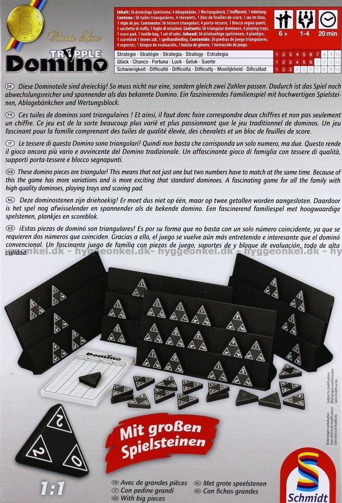 Spelreglerna för Tripple Domino är på engelska. Reglerna är dock i huvudsak de vanliga varför språket inte behöver betyda så mycket.