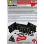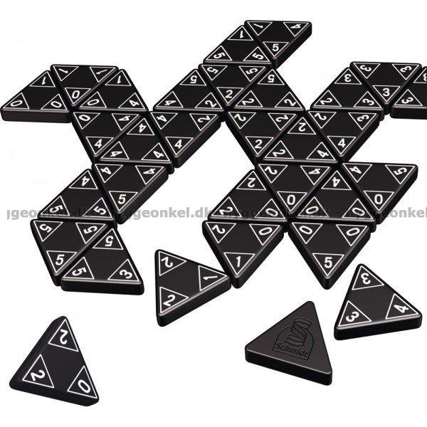 56 trekantiga dominobrickor i hårdplast. Brickorna är ca 3,7 cm på varje sida.