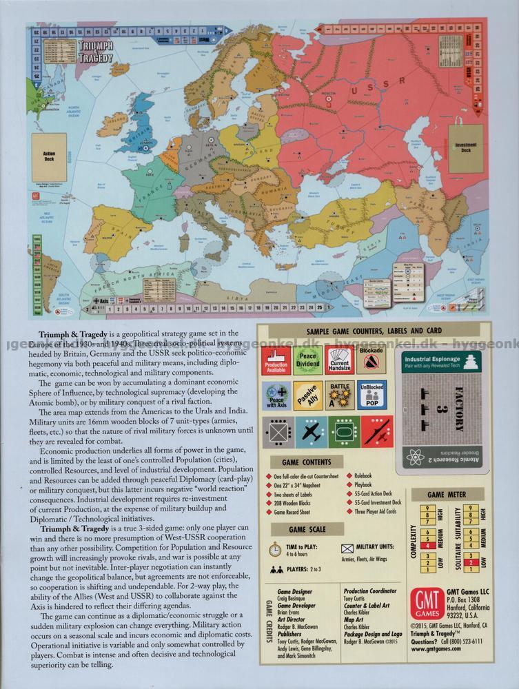 Triumph & Tragedy är ett geopolitiskt strategispel för tre spelare (kan också spelas med två spelare), som handlar om de europeiska stormakternas maktkamp mellan åren 1936-1945. Det är Kapitalismen (Västvärlden), Kommunismen (Sovjetunionen) och Fascismen (Axelmakterna) som är i händelsernas centrum. Spelet bygger på diplomatiska, ekonomiska, teknologiska och militära överväganden, och det finns tre sätt att vinna - ekonomiskt herravälde, teknologisk suveränitet eller militär styrka.