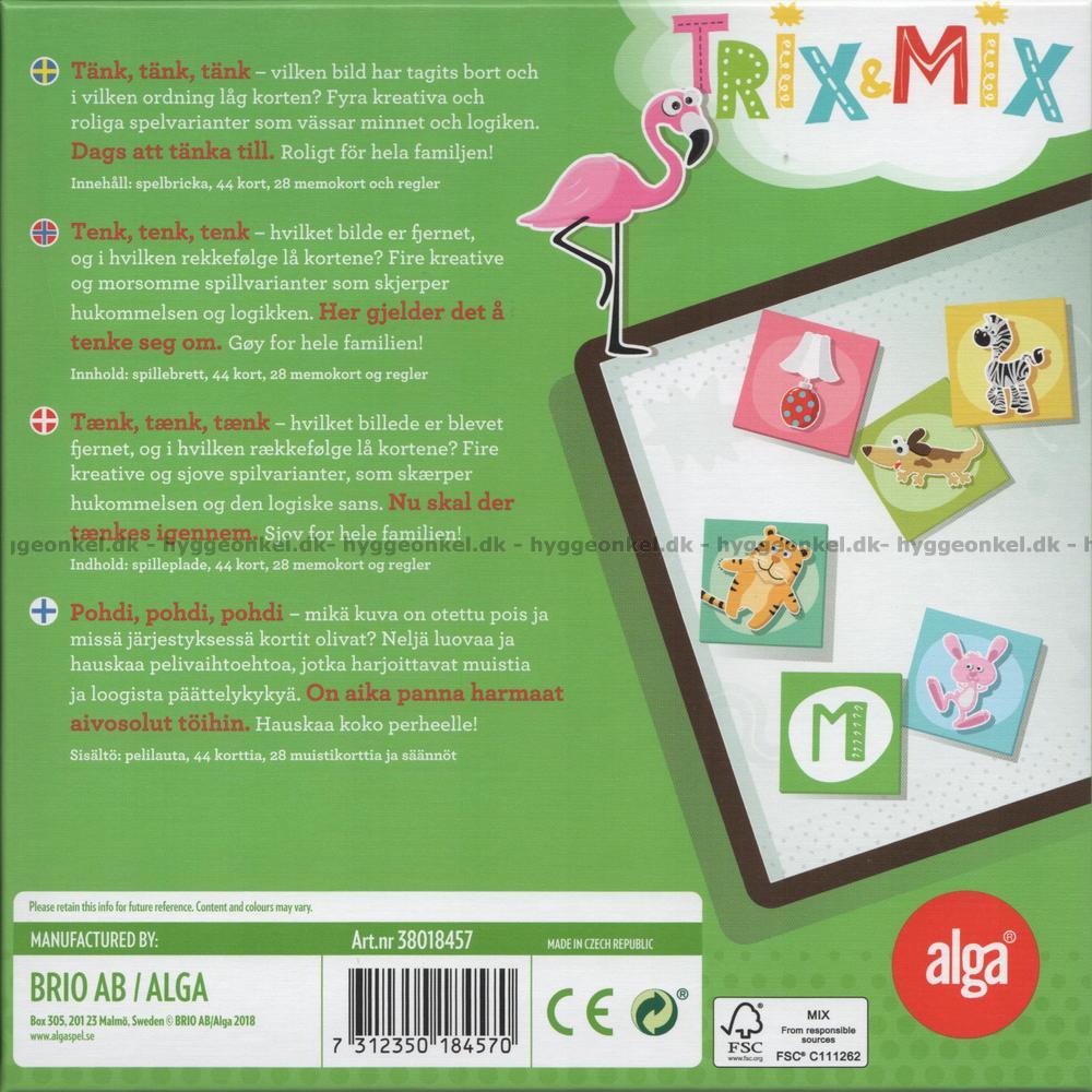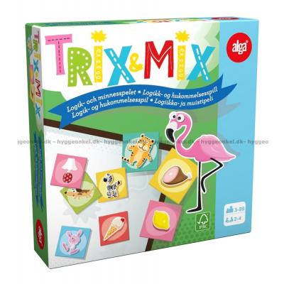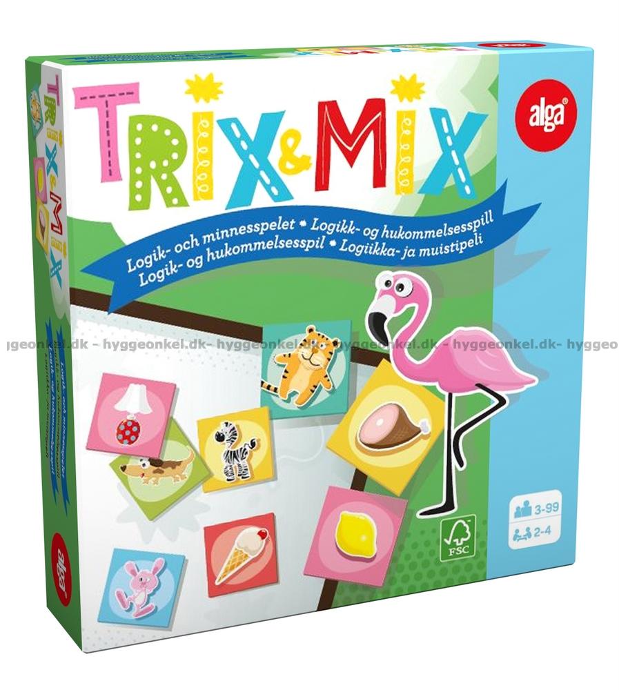 Trix & Mix är ett spel som kan spelas på fyra olika sätt. I asken hittar du brickor och regler för fyra spelsätt. Alla spel påminner om memory på ett eller annat sätt.