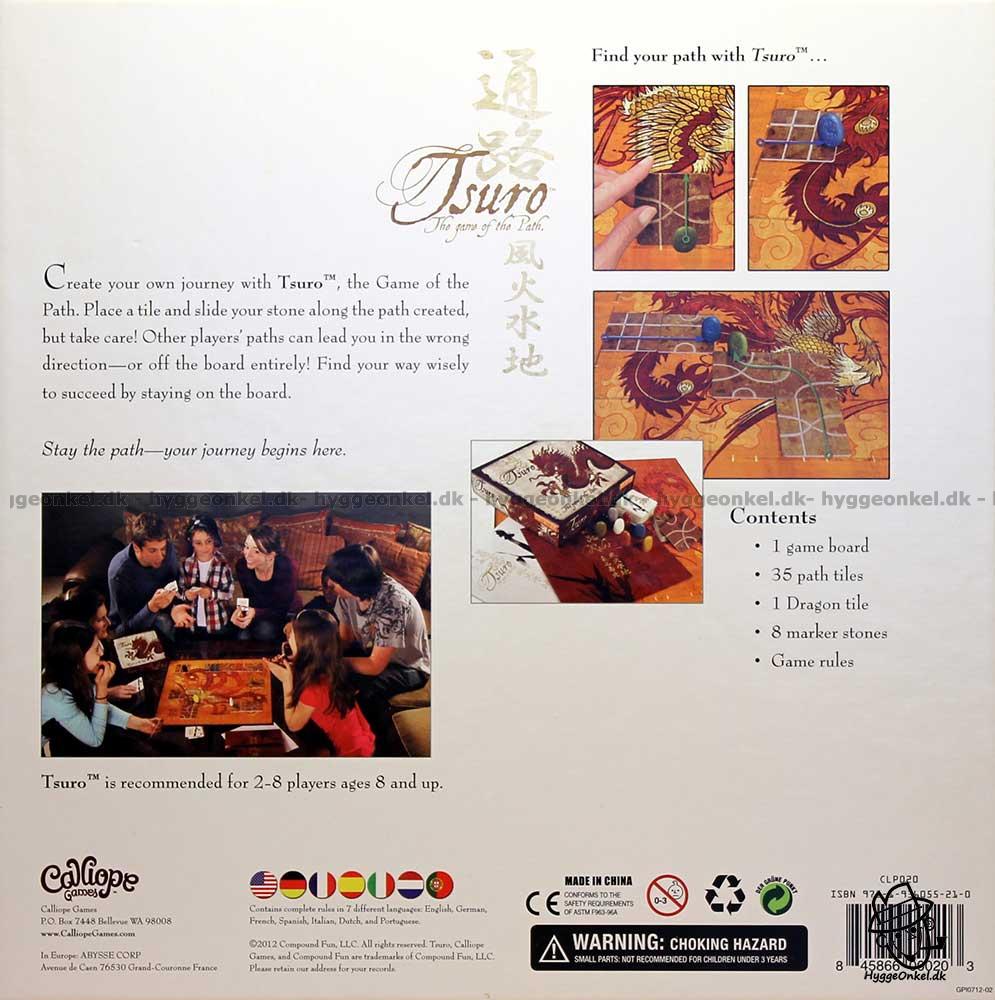 Asken innehåller 1 spelbräde, 35 brickor med vägar, 1 drakbricka, 8 pjäser och ett häfte med spelregler. Spelreglerna är på engelska.