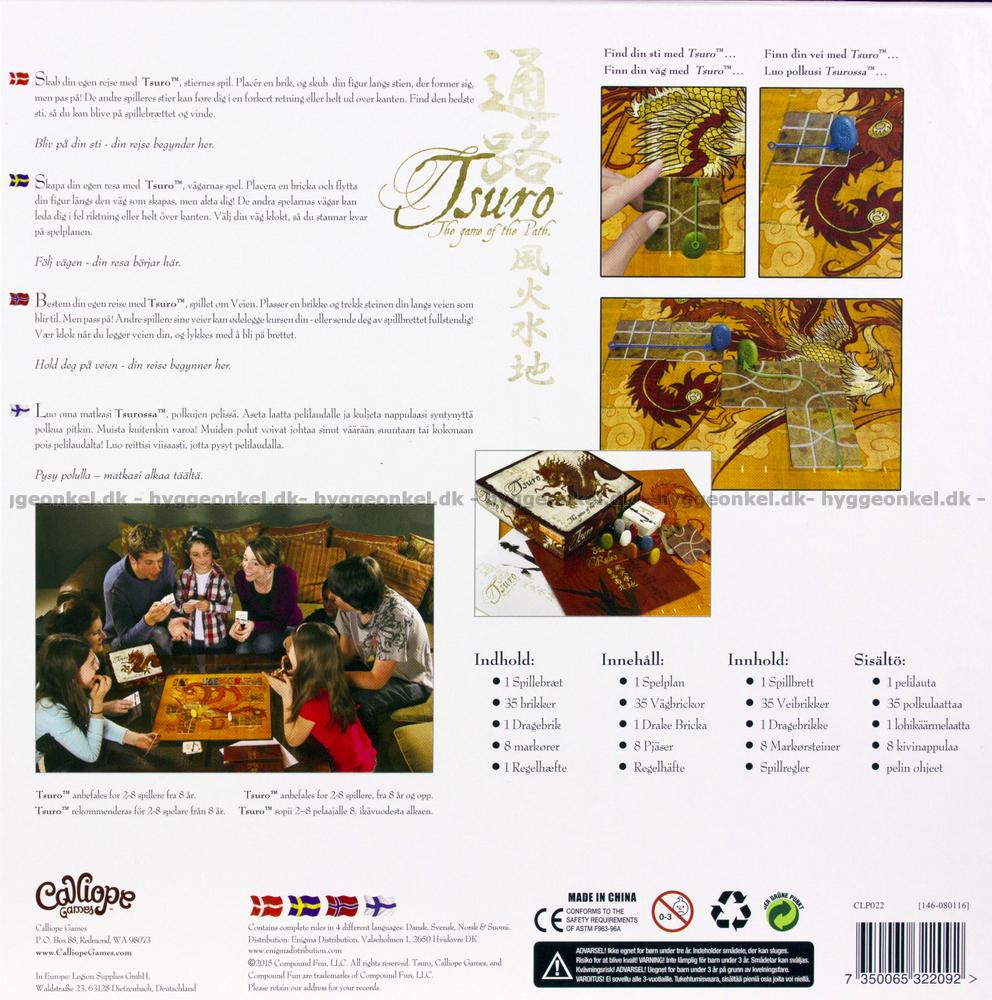 Kartongen innehåller 1 spelbräde, 35 vägbrickor, 1 drakbricka, 8 spelpjäser och regelhäfte på svenska.