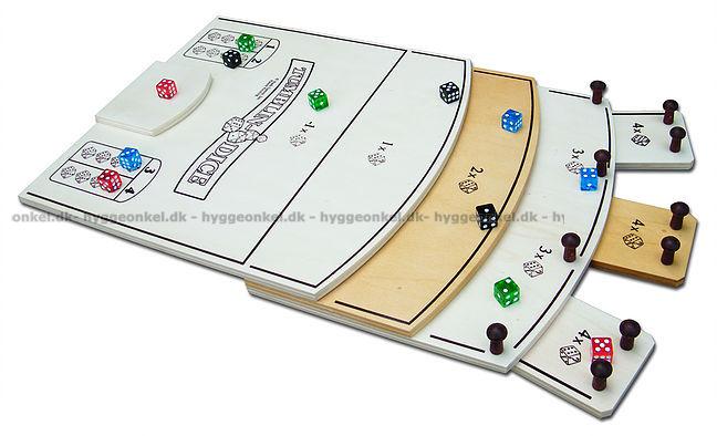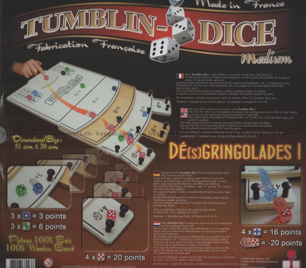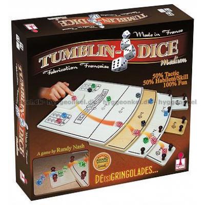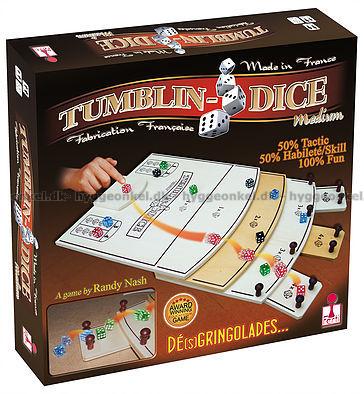 Tumblin-Dice är ett precisionsspel med fyra set tärningar i fyra färger som ska rullas, knipsas iväg och knuffas ner på ett spelbräde som är utformat som en trappa.
