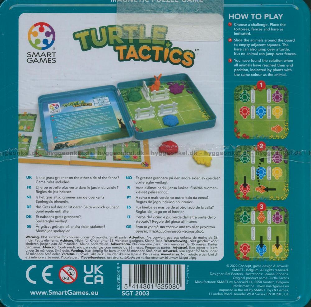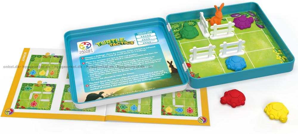 I asken hittar du: Ett häfte med 48 utmaningar (och lösningar), spelplan, 1 hare, 5 sköldpaddor och 4 staket.