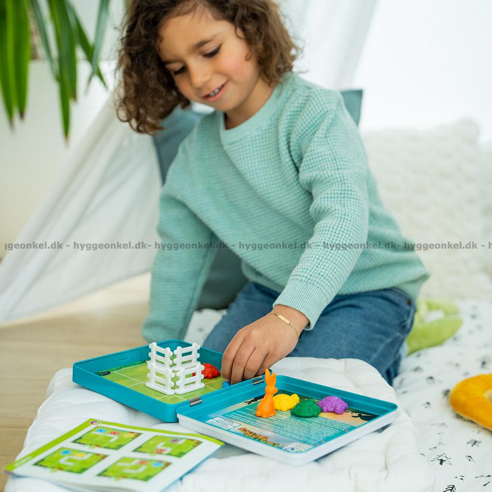 Hjälp sköldpaddorna och haren att komma hem säkert. Inget av djuren kan ta sig över staketen, men haren kan hoppa över sköldpaddorna.