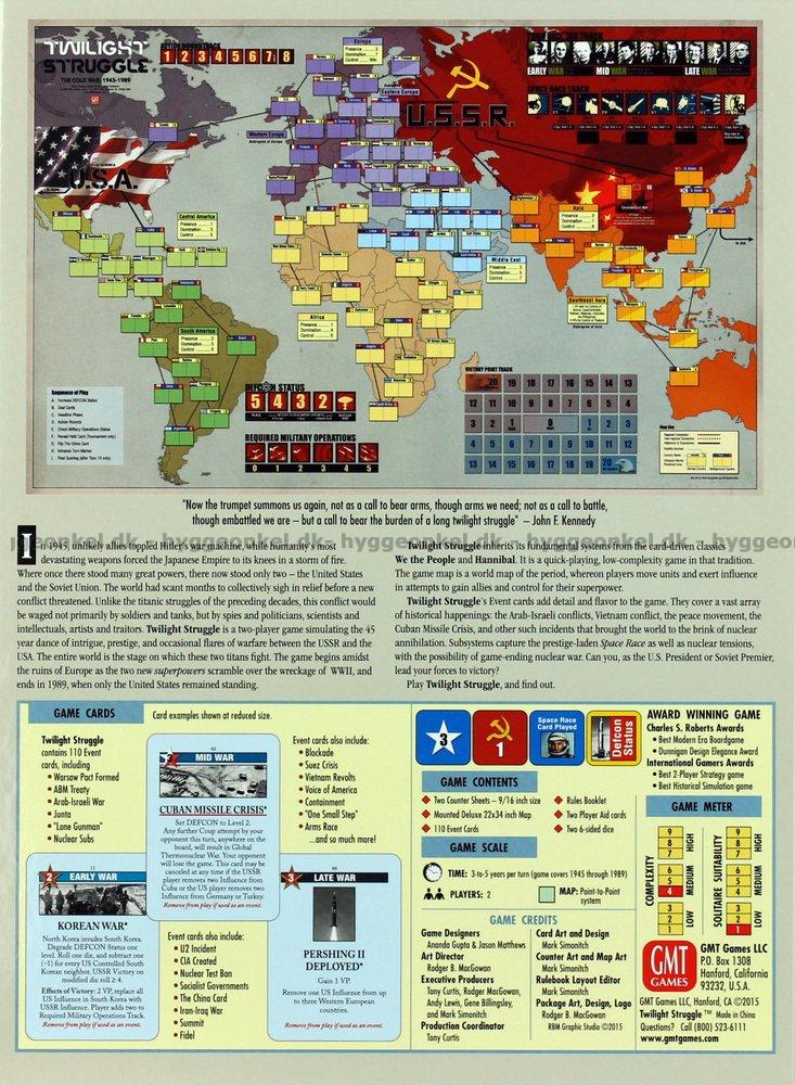 Twilight Struggle är ett mäktigt strategispel som handlar om perioden 1945-1989. Den perioden i världshistorien kännetecknades av nervösa spänningar där både "det röda blocket", men lika mycket "västvärlden", skramlade så mycket med vapnen att ord som skyddsrum, atomkrig och vapenkapplöpning kunde höras i var och varannan konversation.