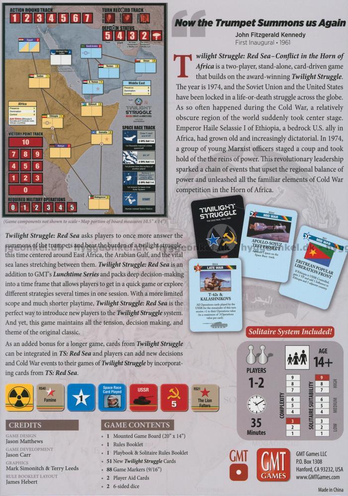 Twilight Struggle: Red Sea – Conflict in the Horn of Africa bygger på det kortdrivna strategispelet Twilight Struggle, men är ett helt fristående spel. Twilight Struggle: Red Sea fungerar utmärkt som en introduktion till detta speluniversum.