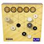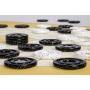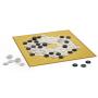 1 spelbräde, 30 vita brickor, 30 svarta brickor och en tygpåse.