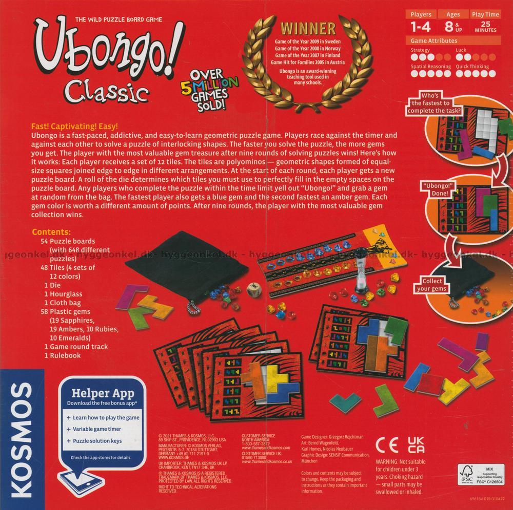 Ubongo är ett snabbt och intensivt spel där alla spelare ska försöka placera sina tetris-bitar på rätt plats så snabbt som möjligt.