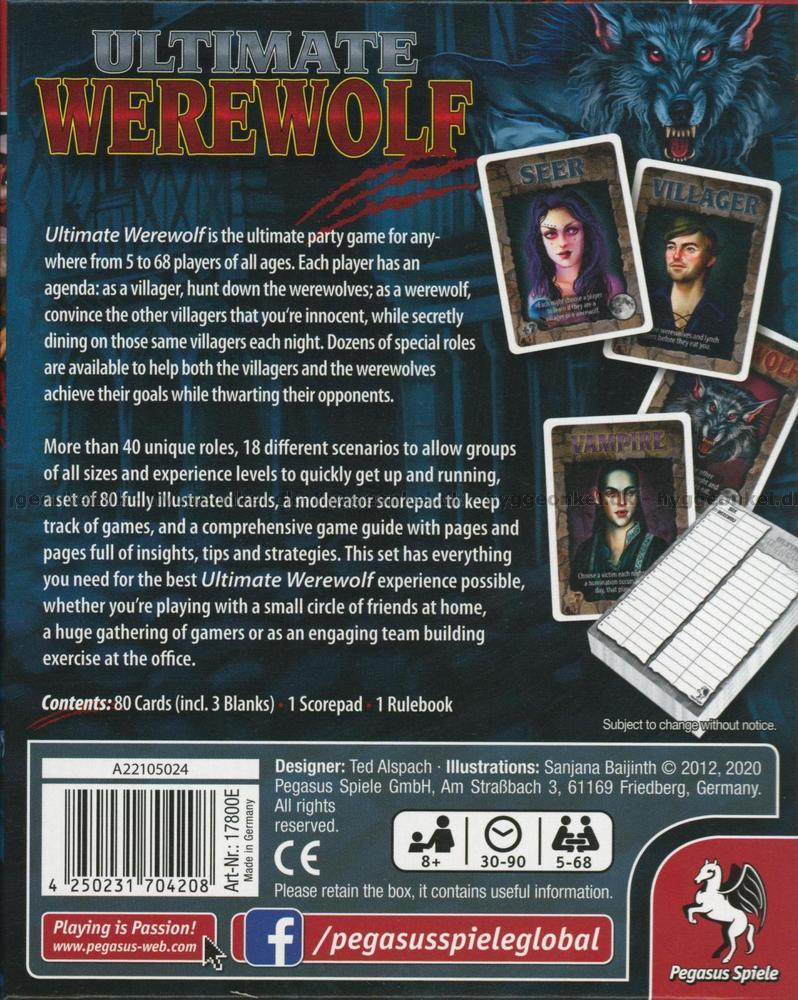 Ultimate Werewolf är det ultimata partyspelet för 5-68 (!) spelare. Varje spelare har en agenda: som bybo ska du jaga varulvar; som varulv ska du bevisa för de andra byborna att du är oskyldig - medan du i hemlighet slukar dem!