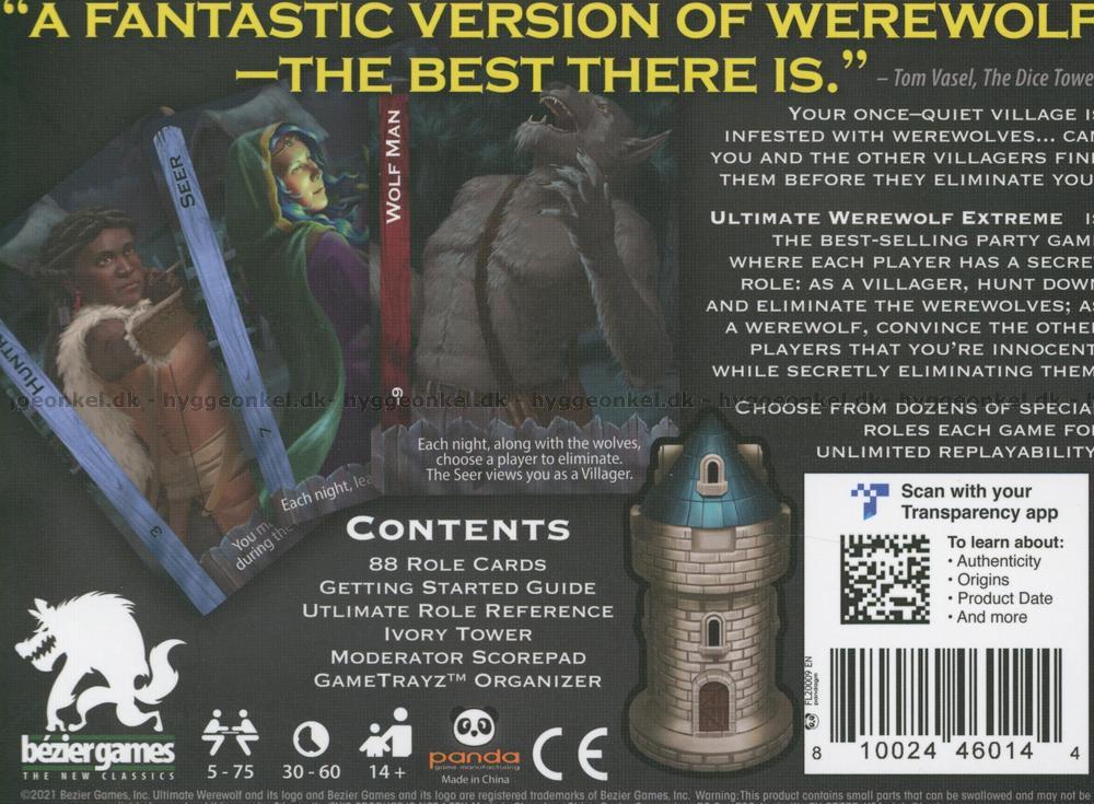 Ultimate Werewolf: Extreme är ett snabbt spel för 5-75 spelare, där alla har en tydlig roll: varulv, siare, bråkmakare eller någon av de andra rollerna. För varje roll finns en speciell egenskap att utnyttja.