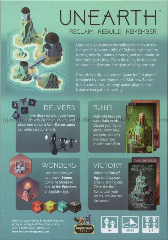 Unearth är ett turspel där du ska placera dina tärningar och samla set. Spelet, som är designat av Jason Harner och Matthew Ransom, tar mindre än en timme att spela och är skapat för 2-4 spelare. Varje spelare har en stam av Delvers, som är representerad av fem tärningar (3 sexsidiga, 1 fyrasidig och 1 åttasidig). Spelarna turas om att slå tärningarna och placera dem i ett försök att göra anspråk på ruinerna.
