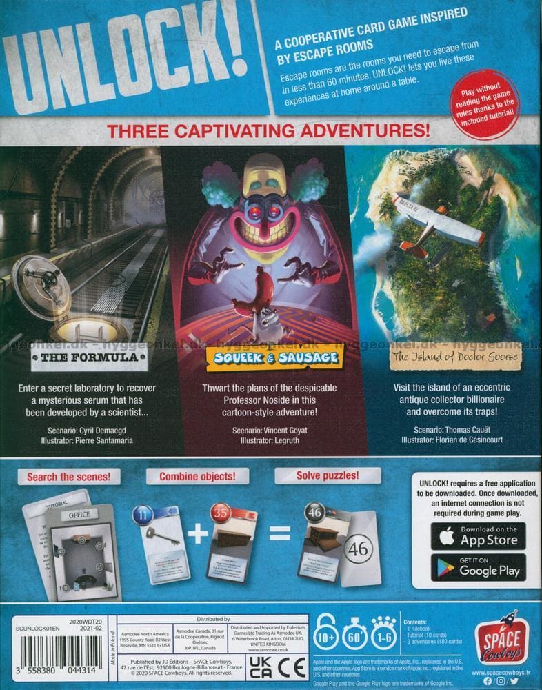 Unlock! är ett samarbetsspel inspirerat av Escape Rooms, som bygger på ett enkelt system som låter er genomsöka platser, kombinera föremål och lösa gåtor. Spela Unlock! för att dra ut på fantastiska äventyr medan ni sitter hemma vid köksbordet! Det enda ni behöver för att få en episk spelupplevelse är korten samt en app. Appen ger ledtrådar, låter er kontrollera koder och håller reda på tiden.
