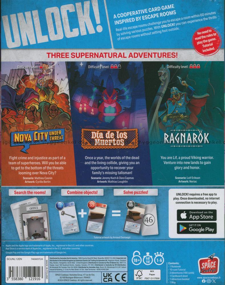 Unlock! är ett kooperativt kortspel inspirerat av Escape Rooms. Det använder ett enkelt system som låter er genomsöka platser, kombinera föremål och lösa gåtor. Spela Unlock! för att dra ut på fantastiska äventyr medan ni sitter vid köksbordet eller vardagsrumsbordet! Det enda ni behöver är korten och en app. Med sistnämnda kan ni få ledtrådar, kontrollera koder och hålla reda på tiden.