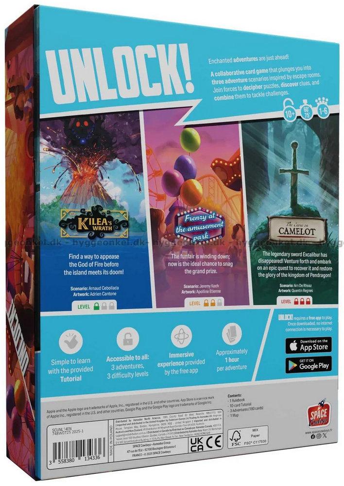 Unlock! är ett kooperativt kortspel inspirerat av Escape Rooms, som använder ett enkelt system som låter er genomsöka platser, kombinera föremål och lösa gåtor. Spela Unlock! för att ge er ut på fantastiska äventyr vid bordet – allt ni behöver är korten och en app som kan ge er ledtrådar, kontrollera koder och hålla koll på er tid.