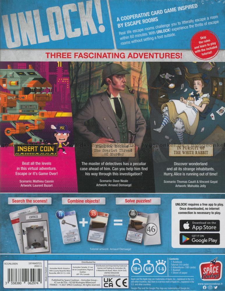 Unlock! är ett kooperativt kortspel inspirerat av Escape Rooms. Spelet använder ett enkelt system som låter er genomsöka platser, kombinera föremål och lösa gåtor. Spela Unlock! för att dra ut på fantastiska äventyr medan ni sitter tryggt hemma. Det enda ni behöver är korten samt en app som kan ge er ledtrådar, kontrollera koder och hålla koll på tiden.
