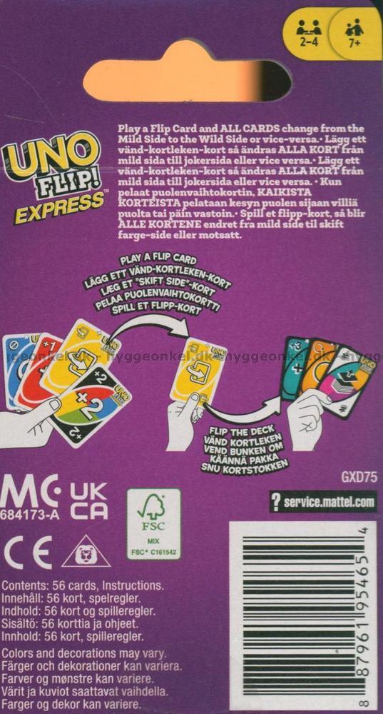 Uno Flip! Express-kortspelet består av 56 kort samt ett set med svenska spelregler.