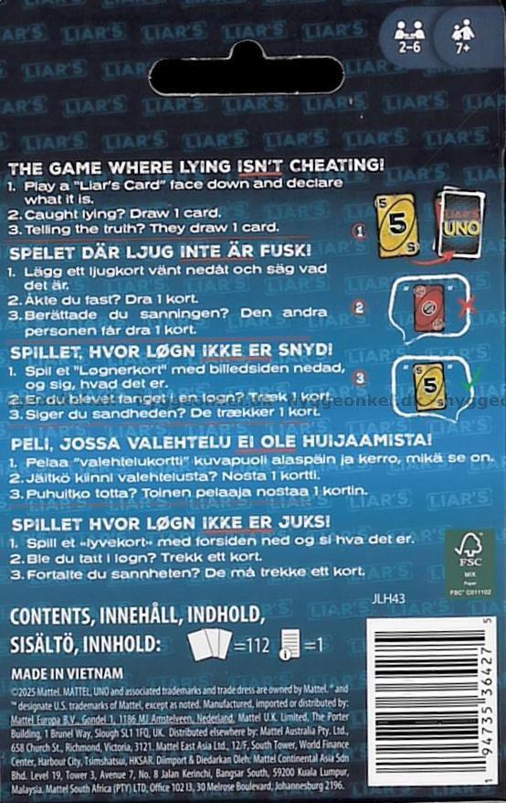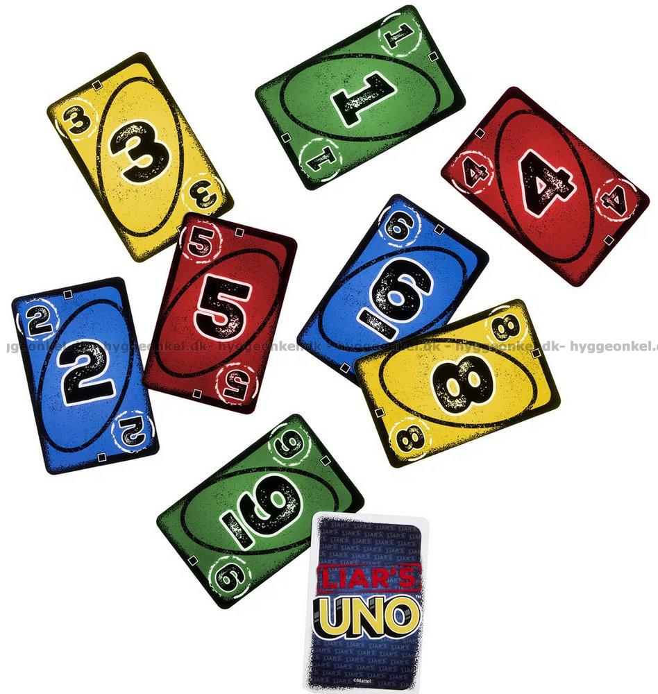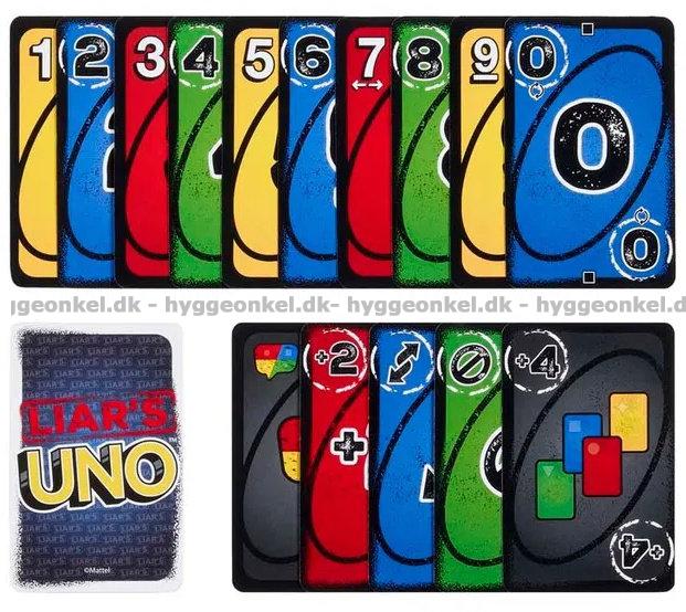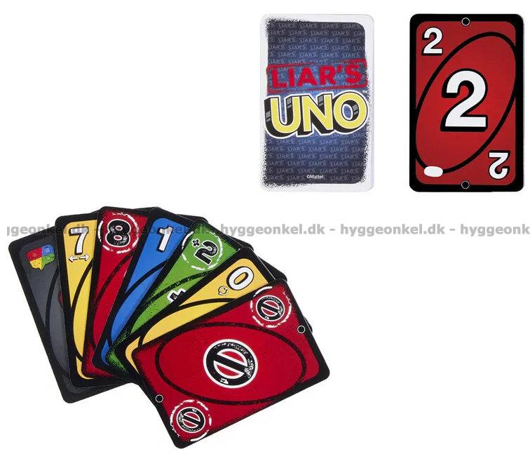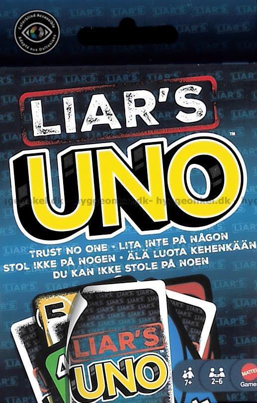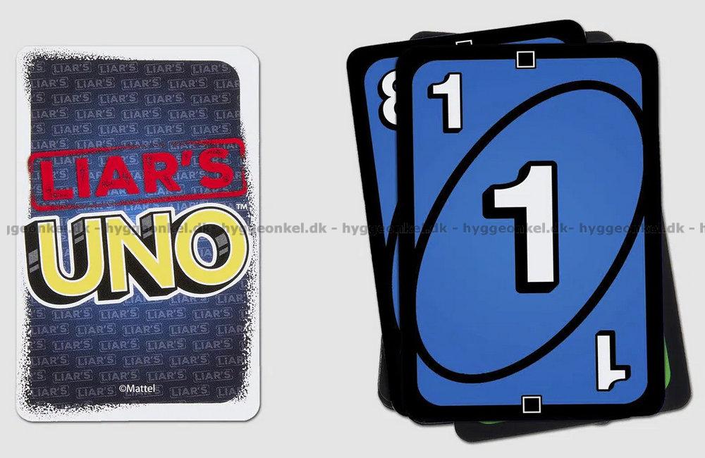 Uno: Liar’s är en underhållande twist på det klassiska kortspelet, där små lögner och djärva bluffar är en helt naturlig del av spelet. Här spelas ett Liar’s-kort med baksidan uppåt, medan spelaren förklarar vilket kort det påstås vara, och spänningen stiger när de andra ska avgöra om sanningen sägs eller om det bluffas. Blir en spelare avslöjad med att ljuga måste hen dra ett kort, men om anklagelsen var fel är det anklagaren som straffas. Spelet handlar om att hålla masken, dölja sina avslöjande drag och spela sina kort med skicklighet, samtidigt som man förstås kommer ihåg att ropa UNO när man bara har ett kort kvar.